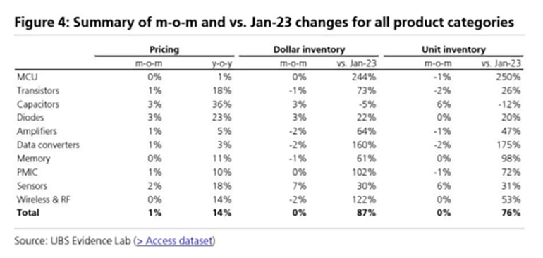 MCUs: Standardized unit inventory declined for the third consecutive month, down 1% MoM, with prices flat MoM but up 1% YoY. Subcategory prices remained stable or saw slight increases. Although current inventory levels remain higher than in January 2023, UBS emphasizes that the category was in severe shortage at the beginning of 2023.