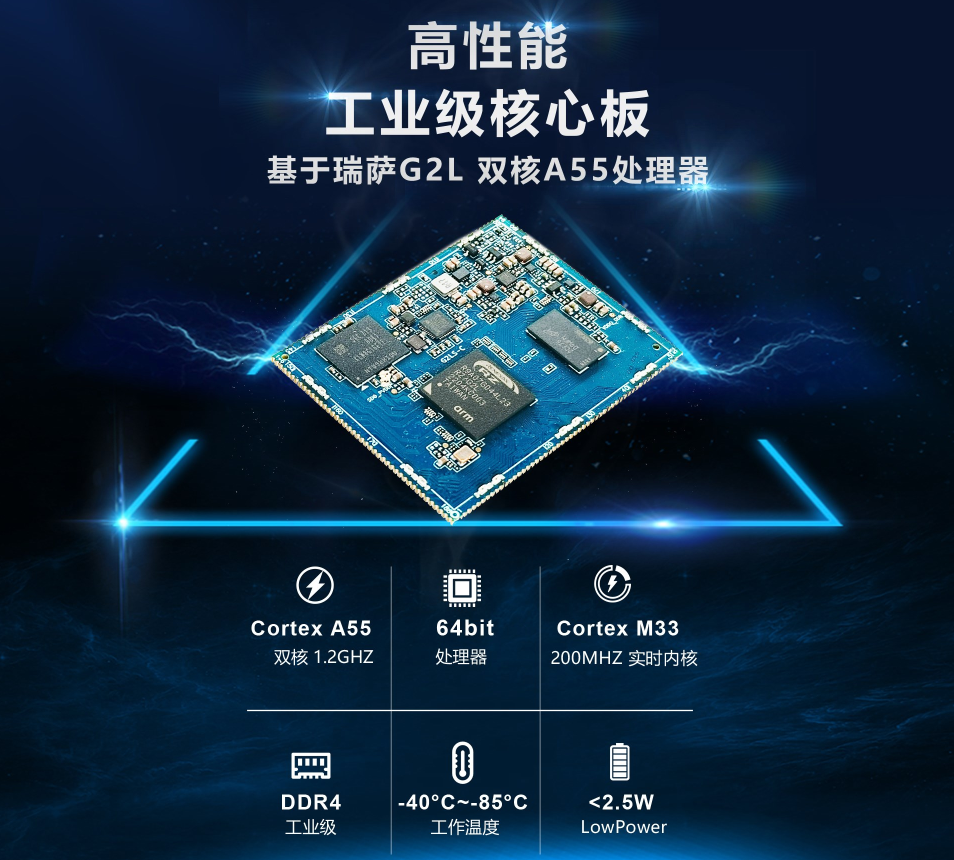 The G2L core board is designed based on the industrial-grade ARM processor series of the Ruisa company. The ARM Cortex-A55 architecture has a operating frequency of 1.2GHz. All components of the core board adopt industrial grade, and the most widest running temperature can reach -40 ° C ~+85 ° C. The DDR4 memory of the plate 2GBYTE is stored, and the storage uses an 8Gbyte EMMC storage chip (1G capacity optional). The rectification performance is stable and the core board resources are rich. A total of 188pincpu pins can achieve different expansion methods according to functional requirements.